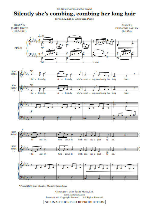 Silently, she's combing her long hair is composed by Desmond Earley, one of Ireland's leading choral specialists and educators.